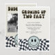 Cool et amusant enfant Retro thème 2ème anniversaire invitation de fête avec des styles rétro Cool avec le motif vérifié et visage heureuxLe texte dit "Growing Up Two Fast." Parfait pour la fête d'anniversaire d'un garçon. carte illustrant l'illustration d'un motif vintage en noir et blanc à damiers. Le texte dit "grandir deux vite."