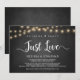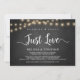Magnifique carte d'annonce / invitation de mariage intime 'Rien de fantaisiste, juste de l'amour', dans un style rustique de ferme avec tableau noir et guirlandes lumineuses. C'est parfait pour votre réception de mariage et votre fête de célébration après le mariage. Ajoutez vos détails dans la même police / lettrage.