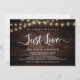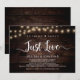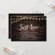 Magnifique carte d'annonce / invitation de mariage intime 'Rien de Fantastique, Juste de l'Amour', dans un design rustique en bois de ferme avec guirlandes lumineuses. C'est parfait pour votre réception de mariage et fête de célébration après-mariage. Ajoutez vos détails dans la même police / lettrage.