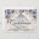 Invitation Quinceañera florale moderne. Conception avec robe argentée, éléments floraux sur un fond perle brillant. Personnalisez davantage avec les détails de votre fête sur le devant.