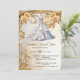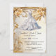 Une belle crème d'ivoire d'aquarelle et un bord tourbillon doré fleuri avec des fleurs roses en faux or le long du bord supérieur forment un cadre autour d'une belle robe blanche nuptiale. La robe a des rouffles et un corps serré et est suspendue au-dessus d'un mannequin. Vous trouverez ci-dessous un script de calligraphie et des modèles de texte en gras pour votre libellé personnalisé. Cette invitation est idéale pour un mariage d'été, de printemps ou d'automne qui se tient dans un jardin ou un lieu extérieur. Célébrez la mariée pour être avec ce design luxueux, tendance et étonnant qui est idéal pour une douche nuptiale, Quinceañera ou entreprise lancer leurs nouvelles robes mariages à des clients.