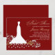 La robe mariage de la mariée blanche, la fleur et tourbillonne sur une invitation à la douche nuptiale arrière - plan rouge foncé. L'invitation RSVP correspondante est présentée ci-dessous: