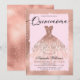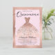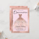 Invitation Quinceañera élégante en feuille rose or et paillettes avec robe rose or et cadre rose or avec éléments scintillants. Personnalisez avec les détails de la fête dans une écriture en lettres capitales tendance.