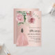 Une invitation moderne, élégante et glamour pour une Quinceañera, 15ème anniversaire. Arrière - plan rose d'or décorée de grands roses roses et de verdure, une fille portant une robe de bal. Le nom est écrit avec un script de style moderne écrit à la main. Personnalisez et ajoutez les détails de votre fête.
