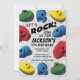 Préparez-vous à ROCK avec cette amusante invitation d'anniversaire d'escalades rock! Parfait pour les fêtes d'anniversaire de la salle de sport et les parcs d'aventure, cet invitation dispose de poignées à main colorées et lumineuses en escalade rocheuse et d'un mur de roche.