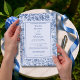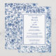 This refined design features a beautifully detailed blue toile floral border surrounding a classic framed layout, inspired by vintage European textiles and romantic garden estates. The delicate botanical pattern creates a sophisticated and graceful presentation, perfect for vineyard weddings, garden ceremonies, estate celebrations, and classic formal events.