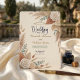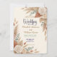 Invite your guests to an unforgettable celebration with earthy rust tones, dried palm fronds, and watercolor pampas grass for an elegant outdoor ceremony.Grounded in formal stationery design conventions, this elegant layout centers a modern calligraphy headline in warm brown and faux gold hues, supported by a highly legible, clean sans-serif secondary text. The composition is framed by an asymmetrical botanical border featuring blooming roses, dried palm fan leaves, and watercolor-style pampas grass plumes against a cream background. The color palette utilizes earthy rust, muted taupe, and soft sage green foliage, creating visual depth through simulated shadows and a subtle printed paper grain effect.This is a flat printed image with a printed paper grain and faux gold effect, not actual raised material.