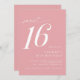 Invitations modernes de 16ème anniversaire avec accents de script. Simple, décontracté et joli. Couleur rose pâle douce avec police blanche.