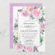 Roses et pivoines violettes et roses aux lilas violets et blancs forment un cadre luxuriant sur cette invitation de Quinceanera. Le dos est une aquarelle rose et violet unique avec juste la pointe des contours roses. Tout le texte peut être facilement édité pour créer un souvenir personnel.