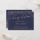 Annoncez le report de votre mariage et de nouveaux plans avec ce moderne, chic et élégant conetti en rose gold et bordure géométrique rose gold nouvelle écriture de plans avec police de caractères sur fond bleu marine modifiable.