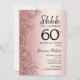 Rose Gold Surprise 60th Birthday Party Invitation. Design féminin de glam avec accents botaniques et police de script de typographie. Carte invitation florale simple parfaite pour une célébration anniversaire surprise femme élégante. Peut être customisé à n'importe quel âge. Invitations Zazzle imprimées ou téléchargement instantané modèle imprimable numérique.