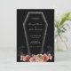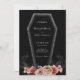 Sombre et belle, cette faire-part de mariage de cercueil est parfaite pour un mariage gothique ou d'Halloween. Le café a une parties scintillant grise brillant autour des bords et un agencement floral d'une variété de roses, plumes et épines. Voir la coordination des articles dans notre boutique, Enchanted Finch.