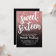 Invitation de fête d'anniversaire sweet sixteen. Célébrez seize en style avec ce design moderne et festif. L'avant est orné d'un arrière - plan de parties scintillant en or faux rose qui se fonde dans un dégradé noir élégant en bas, avec les mots "Sweet sixteen" magnifiquement mis en surbrillance par le haut en écriture élégante. Un mélange de script et de polices modernes propres en blanc immaculé crée un contraste saisissant qui semble à la fois chic et intemporel. Le dos est doté d'un arrière - plan noir solide pour une finition simple et polie. Idéal pour fêter l'âge de 16 ans, cette invitation peut être customisée avec votre choix de police et de couleurs arrière - plans pour s'adapter à n'importe quel thème de fête. Rose Parties scintillant or Noir Gradient Sweet sixteen Anniversaire Invitation Moderne Élégant Script Veuillez noter que la parties scintillant est une image imprimée, pas une parties scintillant ou un papier à papier. Disponible sous forme d'invitation imprimée ou d'invitation numérique téléchargeable que vous pouvez envoyer par courriel ou imprimer localement !