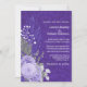 Invitation de mariage élégante avec un aspect damassé violet, avec des graphiques de roses de lavande et de jolies plumes scintillantes et des accents de feuilles. Personnalisez le texte personnalisé blanc pour votre jour spécial.
