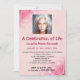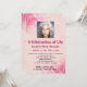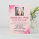 Cette carte modifiable présente une photo en haut. Celle-ci est modifiable afin que vous puissiez la remplacer par la photographie de votre proche. En dessous, se trouvent les détails de la célébration sur un fond rose pâle avec des roses dans deux coins. Tout le texte sur le devant de la carte est modifiable, vous pouvez donc modifier les détails ainsi que le style de police, le placement, la couleur et la taille pour la personnaliser. Au dos se trouve un champ modifiable pour des informations supplémentaires. Cette invitation modifiable peut être utilisée pour une célébration de vie, des anniversaires, des fiançailles, des anniversaires de mariage, des retraites, etc.