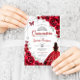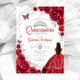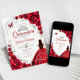 Invitation à la célébration de la Quinceanera rouge, argent et blanc. Caractéristiques, brunette fille en robe de robe de bal police, papillons, roses d'aquarelle et tiara. Parfait pour une élégante célébration de glamour de style princesse. Personnalisez avec vos propres détails. Invitations Zazzle imprimées ou téléchargement instantané modèle imprimable numérique.
