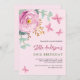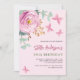 Un arrière - plan rose clair. Décoré d'une rose rose rose et d'une verdure d'eucalyptus vert aquarelle et de papillons. Personnalisez et ajoutez votre nom et les détails de votre fête.