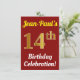 Ce design d’invitation à la fête d’anniversaire comporte un message comme "14e anniversaire de Jean-Paul!", où le nom peut être customisé, et où le numéro "14e" a un faux aspect doré. Il est également décoré d'un arrière - plan de couleur rouge. Les détails de l'événement sur le dos peuvent être personnalisés. Il pourrait être utilisé pour invitation des gens à la fête du quatorzième anniversaire ou à la fête d’anniversaire de quelqu’un. [~Z0000120]
