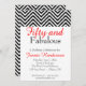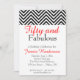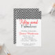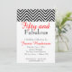 Une grande invitation d'anniversaire pour une toute dame. Elle comporte un motif noir et blanc de chevron au dessus de l'invitation. Vous customisez l'information de partie sur l'avant en noir et rouge.