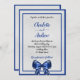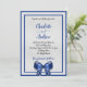 Un établissement moderne, élégant et faire-part de mariage. Arrière - plan à l'aspect argent faux décoré avec des cadres bleu royal et arc. Personnalisez et ajoutez vos noms et les détails du mariage. Lettres de couleur noire.