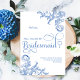 © Socialite Designs Inc. Belles tourbillons d'angle et fleuris "serez-vous ma demoiselle d'honneur" carte, peinte en aquarelle bleu roi doux, qui complète la collection mariage correspondante. Une carte élégante pour toutes les fêtes de l'année. Si vous avez besoin d'aide pour customiser ou souhaitez d'autres produits créés avec ce design, n'hésitez pas à contacter Socialite Designs.