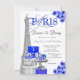 Paris Sweet 16 anniversaire invitation avec belle tour Eiffel en argent, forfaits cadeaux Paris élégants, chaussures talon haute parties scintillant en argent et script royal bleu Paris sur un riche arrière - plan floral bleu. Cette belle invitation d'anniversaire Paris sweet sixteen est facilement customisée pour votre événement en ajoutant simplement vos détails dans le style de police et de couleur, et la formulation de votre choix. Il s'agit d'un design imprimé sans véritable diamants, bijoux, parties scintillant, etc.