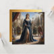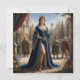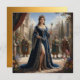 A regal queen, adorned in an elaborate blue velvet gown with silver embroidery and a golden crown, stands holding a scepter in the courtyard of a grand stone palace. She is flanked by several noblemen or guards in medieval attire, amidst lush gardens and architectural details under a bright sky.