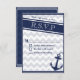 Invitations RSVP bleu et blanc marine du chevron nautique - le design avant est composé d'une bannière et d'une ancre sur une corde. Les motifs, le texte et les contours sont en bleu marine avec un arrière - plan en chevron blanc. Sur le dos se trouve une ancre blanche plus grande qui se trouve au-dessus d'un arrière - plan chevron bleu marine. Le papier par défaut est défini sur stock d'invitation de base, mais peut être modifié en cliquant sur 'choisir votre style' puis en utilisant la zone de liste déroulante Papier choisissez une des options. Pour modifier la police, la taille de la police ou la couleur de la police, cliquez sur le bouton personnaliser sous le faire-part de mariage nautique. Notez que vous devrez peut-être la customiser si certains termes sont trop longs, de sorte qu'ils correspondent mieux à la conception. Si vous êtes satisfait du paramétrage de la police, vous pouvez utiliser la fonction de personnalisation pour modifier les informations de démonstration à vos données personnelles. Cliquer sur les petites images de l'avant/de l'arrière de la carte avec changement sur ce côté pour qu'il puisse être modifié. Une fois terminé, vérifiez que les informations que vous avez appliquées sont correctes et que vous n'avez pas d'erreurs d'orthographe des deux côtés de la carte. D'autres produits qui vont avec celui-ci.