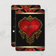 RSVP rouge, noir et or avec un riche cœur en satin rouge et un fond damassé rouge, noir et or. Ce RSVP de mariage élégant en rouge, noir et or est facilement personnalisable avec vos détails d'événement.