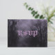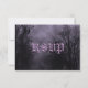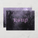 Réponse personnalisée modèle de carte RSVP avec un script grungy et des lettres gothiques traditionnelles sur un ciel d'Halloween éffrayant avec des arbres brumeux le long d'une route hantée sombre, des corbeaux et une pleine lune nuageuse et une teinte violette. Cliquez sur Customiser pour modifier les polices, le dimensionnement et bien plus encore, enregistrez même votre conception pour plus tard.