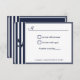 Invitations RSVP avale bleu marine nautique - le design avant comporte un ruban d'ancrage avec un contour qui longe les bords de la carte. Les motifs et le texte sont bleu marine sur un arrière - plan blanc. La conception du dos continue le ruban autour de la carte et les couleurs du contour et de l'arrière - plan ont maintenant été changées, où le contour est blanc et l'arrière - plan bleu marine. Au milieu se trouve deux hirondelles en vol, travaillant ensemble pour porter une ancre sur une corde. Le papier par défaut est défini sur stock d'invitation de base, mais peut être modifié en cliquant sur 'choisir votre style' puis en utilisant la zone de liste déroulante Papier choisissez une des options. Chaque invitation est accompagnée d'une enveloppe blanche. Pour modifier la police, la taille de la police ou la couleur de la police, cliquez sur le bouton personnaliser sous l'invitation RSVP Nautique. Notez que vous devrez peut-être le customiser si certains termes sont trop longs et qu'ils correspondent mieux à la conception. Si vous êtes satisfait du paramétrage de la police, vous pouvez utiliser la fonction de personnalisation pour modifier les informations de démonstration à vos données personnelles. Cliquer sur les petites images de l'avant/de l'arrière de la carte avec changement sur ce côté pour qu'il puisse être modifié. Une fois terminé, vérifiez que les informations que vous avez appliquées sont correctes et que vous n'avez pas d'erreurs d'orthographe des deux côtés de la carte. D'autres produits qui vont avec celui-ci.