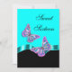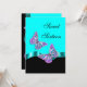 Faire-part de mariage élégant sur la plage / anniversaire / anniversaire spécial, invitations polyvalentes avec des modèles de texte personnalisables. CONCEPTION : Sur un fond aquamarine, turquoise et noir, deux papillons roses vibrants avec des ailes "bleu ciel", argent et violet reposent sur un ruban scintillant. PERSONNALISEZ-LE - La couleur de fond, le libellé, le style de police et la couleur de police peuvent être modifiés à votre guise en utilisant le bouton "personnalisez-le". UTILISEZ-LE POUR : Fiançailles, mariages, anniversaires, enterrements de vie de jeune fille, anniversaires de mariage, soirées à thème tropical exotique sur la plage et événements personnels ou d'entreprise spéciaux, fonctions, rassemblements ou banquets que vous organisez. ENVELOPPES : Des enveloppes blanches simples sont incluses. COMMANDES