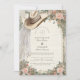 Un design mariage occidental rustique avec un casquette de cowgirl au voile de dentelle, entouré de roses blush doux et de verdure boho. Idéal pour les mariages de granges de campagne, les célébrations western chic et les cérémonies de plein air rustiques.