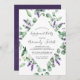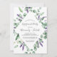 Cette invitation à la fête de la lavande rustique et de l'eucalyptus est parfaite pour un événement extérieur simple et élégant. Le design floral présente des feuilles d'eucalyptus aquarelle et de la verdure avec des sprigs de fleurs sauvages violets.