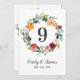Les cartes de numéro de table mariage de style romantique rustique comprennent des numéros encadrés par une couronne d'aquarelle fleurie d'été et d'automne avec de beaux roses, dahlias, des fleurs de pivoines et de la verdure, dans une magnifique palette automnale de rouge bordeaux, jaune doré, orange pêche, rose roux et tons verts.