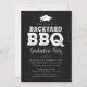 Invitation à la fête de remise des diplômes du barbecue rustique avec une casquette de remise des diplômes en haut et des lettres de tableau noir avec un arrière - plan de tableau noir. Personnalisez l'invitation de la fête de remise de diplômes avec le nom du diplômé et les détails de la fête. Les invitations sont parfaits pour les fêtes de fin d'études secondaires et collégiales !