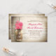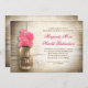 magnifique arrière - plan de bois rustique et bocal de mason avec fleurs roses répétition invitations dîner. Je suggère un beau papier de texture de lin pour ce design.