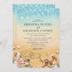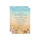 Destination de plage tropicale invitations de mariage avec un arrière - plan rustique ombre jaune à bleu aquarelle, étoiles de mer, coquillages, lumières à cordes, deux coeurs dans le sable avec vos initiales, et un élégant modèle de mariage qui est facile à personnaliser.
