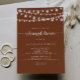 Cette corde rustique illumine la répétition de terre cuite invitation à dîner est parfait pour un événement simple. Le design comprend de belles lampes à cordes peintes à la main dans un arrière - plan en terre cuite.