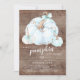 Sweet little citrouille est en route baby shower invitation avec des citrouilles bleu clair ornés de arcs bleus posés sur un arrière - plan en bois rustique.