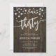 Invitation de fête du 30e anniversaire. Design rustique avec motif en bois brun foncé. Carte invitation classique avec lumières à cordes et police de script. Parfait pour une trentième célébration anniversaire. Personnalisez avec vos propres détails. Peut être customisé pour n'importe quel âge ! Invitations Zazzle imprimées ou téléchargement instantané modèle imprimable numérique.