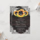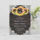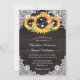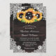 Invitations de mariage de tournesol rustique personnalisées idéales pour une fête de campagne, de jardin ou de grange inspirée des tournesols. Objets assortis disponibles pour compléter ces invitations de mariage florales rustiques avec des tournesols sur un arrière - plan en bois rustique orné de dentelle fleurie blanche et de lampes à cordes.