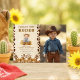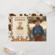 Célébrez le premier anniversaire de votre petit cowboy avec cette ravissante invitation à la photo de rodéo. Dotée d'un design occidental rustique, cette invitation présente un adorable cow-boy assis sur une balle de foin, avec un arrière - plan d'imprimerie de vache et de désert. Personnalisez-vous avec les détails de votre fête et préparez-vous à rassembler vos invités pour une journée amusante d'aventures rodéo, de promenades à cheval et de divertissement cowboy.
