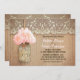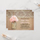 Joli faire-part de mariage rustique avec bocal de mason avec fleur d'hydrangée rose. Invitation parfait pour le mariage campagnard avec dentelle vintage et des accents en bois.