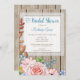 Une charmante invitation à la douche nuptiale rustique avec un joli bouquet rose sur un arrière - plan en bois avec cadre en dentelle blanche. Parfait pour un thème de la douche nuptiale de campagne.