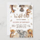 Notre adorable invitation au 1er anniversaire présente des bébés animaux ludiques, dont un singe, une girafe, une autruche, un lion, un éléphant et un tigre, le tout dans un cadre magnifique de pampas et de feuilles de palmiers. Un script sophistiqué et des détails complexes font de ce design vraiment unique.