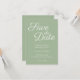 Le texte de la typographie Save the Date est un beau style contemporain élégant de calligraphie en blanc contre sage solide. Ajoutez votre propre photo de fiançailles à l'arrière si vous le souhaitez. Customisez la couleur verte de l'arrière - plan pour correspondre à votre palette de couleurs mariage. Cet élégant mariage de calligraphie, sauf l'invitation à la date, se trouve sur une variété d'arrière - plans décoratifs.