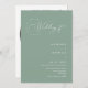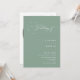 Cette élégante invitation de mariage présente un design raffiné avec un texte romantique en arc qui comprend les mots "Mariage de" élégamment écrit en haut, ajoutant une touche formelle et intemporelle sur un arrière - plan vert sage. Associée à une typographie serif épurée et à une écriture manuscrite moderne, cette invitation minimaliste est parfaite pour les couples à la recherche d'un équilibre entre sophistication et simplicité. Le design comprend également de l'espace pour une photo du couple et un code QR à l'arrière pour des options RSVP sans soudure. Essayez d'être vert avec cette invitation tout-en-un écologique moderne en coupant sur les RSVP supplémentaires et les cartes de détails. Ajoutez simplement votre propre code QR au verso de l'invitation pour que vos invités puissent accéder à RSVP et découvrez plus d'informations sur votre mariage. Customisez les noms et le libellé en quelques étapes simples, et personnalisez la carte d'invitation avec votre photo du couple heureux pour lui donner une touche unique et personnelle. Veuillez noter : Le texte géométrique circulaire de "Merci de vous joindre à nous pour le" ainsi que l'élégante belle typographie de "Mariage de" sur le devant de l'invitation ET le libellé "gentiment répondre par" sur le dos de l'invitation ainsi que d'autres éléments d'illustration graphique comme les lignes ne peuvent pas être modifiés, modifiés, déplacés ou supprimés. Elles sont réparées. Si vous devez modifier la couleur, vous pouvez customiser la carte d'invitation. Vous pouvez facilement personnaliser cette invitation avec votre propre texte et la partager numériquement par texte, e-mail ou médias sociaux. Vous pouvez également envoyer une version imprimée à vos invités ou faire les deux : en envoyant une version numérique et en faisant un suivi avec une copie imprimée pour une expérience plus personnalisée.