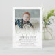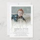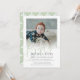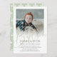Invitation au baptême minimaliste en avec baptême écrit dans un script de pinceau vert pâle. Ajoutez le nom et le texte en gris mou. Personnalisez avec une photo de votre bébé. Le dos est orné d'un motif vert et blanc avec croix.