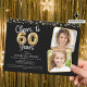 Célébrez un 60e anniversaire avec ces invitations de fête élégantes et festives avec le titre CHEERS TO 60 YEARS avec des numéros de ballon métallique et la typographie de script moderne, 2 photos et serpentins en or et confetti dans votre choix de couleur arrière - plan (montré en noir). ASSISTANCE : Pour obtenir de l'aide sur la modification ou la personnalisation de la conception, le transfert de la conception à un autre produit ou si vous souhaitez coordonner des éléments, contactez le concepteur AVANT de commander par Zazzle Conversation ou par courriel makeitaboutyoustore@gmail.com.